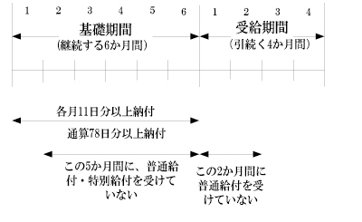 納付要件が、普通給付と重複してはいけない。 ・1のところで普通給付を受けていても、その前2か月間の納付によるものだから、重複しない。 ・2、3、4、5、6のいずれかで普通給付を受けていること は、1から5の間の納付のどれかを普通給付のために使ったことになるのでだめ ・その後の1、2の間で普通給付を受けていることは5、6あるいは6の納付を普通給付のために使ったことになるのでだめ ・2から6までのいずれかで特例給付を受けた場合も、やはり重複があるのでだめ。(条文上は、55条3項により、普通給付の支給を受けたとみなされるのでだめとしているが、意味は同じ)